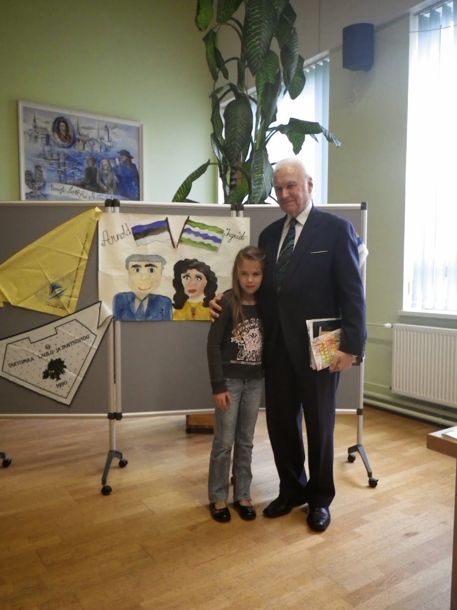 Hariduspäevale muusikalist tervitust esitama kutsutud Kambja kooli õpilane Laura Lotta Sägi suutis forseliuslasi üllatada sellegagi, et tõi saalikaunistuseks suure pildi, millele tema kunstnikukäsi oli maalinud president Arnold Rüütli ja proua Ingrid Rüütli.